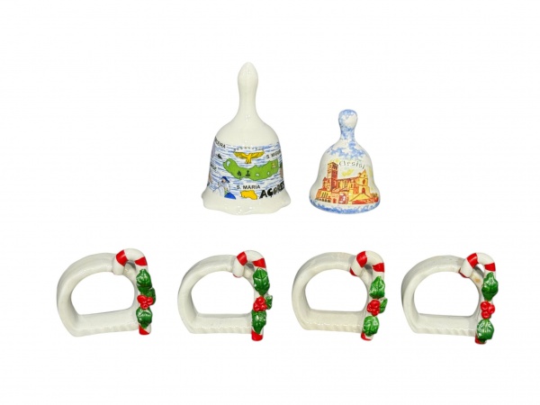 • PORCELANAS, lote com seis (6) peças de modelos, tamanhos e decorações distintas confeccionadas em porcelana na tonalidade branca, sendo: A) 2 sinetas, maior medindo 9x5,5cm e menor 6x4,5cm e B) 4 porta guardanapos com motivos natalinos em policromia, medindo 5x5cm 1 colado.