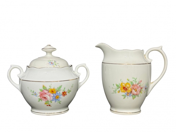 • PORCELANA REAL, duas (2) peças, sendo: A) 1 açucareiro, medindo 10x12,5x7cm e B) 1 leiteira, medindo 10,5x10,5x5cm, confeccionadas em porcelana na tonalidade branca, com pintura de elementos florais em policromia e filetes em ouro.
