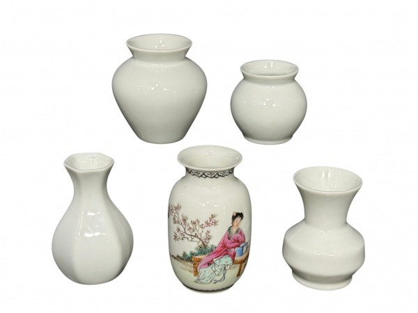 • PORCELANAS, lote com cinco (5) vasos confeccionados em porcelana na tonalidade branca de modelos, tamanhos e decorações distintas, maior medindo 8,5x4cm e menor 5,5x4cm.