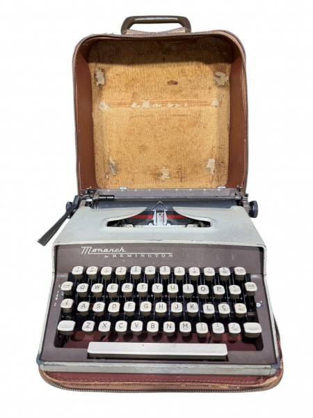 • DIVERSOS, uma (1) máquina de escrever da marca REMINGTON, modelo MONARCH, corpo em metal com pintura na tonalidade cinza e marrom, apresenta sinais de oxidação, acondicionada em estojo em couro com desgastes, medindo 11x32x31cm.