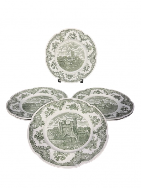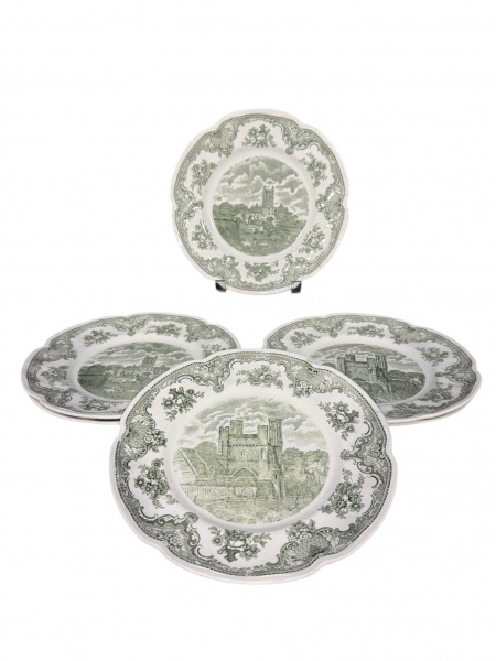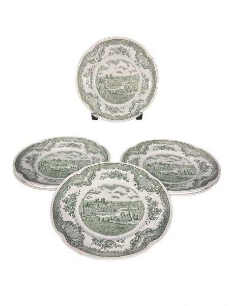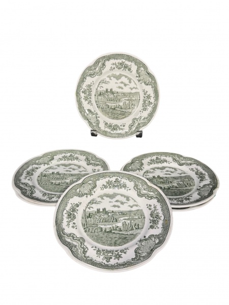 • Cerâmica Matarazzo (Fundada no início do século XX, a fábrica ficava em São Caetano do Sul, São Paulo), seis (6) pratos rasos confeccionados em faiança na tonalidade branca, ricamente decorada por paisagem de castelo, elementos florais e vegetalistas na tonalidade verde, borda em recortes, medindo 23cm, apresenta 1 bicado e alguns com falhas na vitrificação na borda.