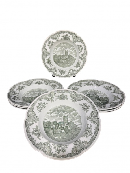 • Cerâmica Matarazzo (Fundada no início do século XX, a fábrica ficava em São Caetano do Sul, São Paulo), oito (8) pratos fundos confeccionados em faiança na tonalidade branca, ricamente decorada por paisagem de castelo, elementos florais e vegetalistas na tonalidade verde, borda em recortes, medindo 22,5cm, 1 bicado e 1 com fio de cabelo, alguns com falhas na vitrificação da borda.