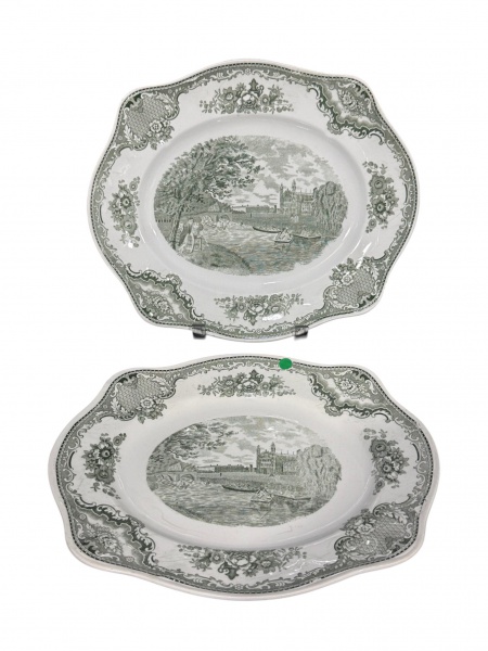 • Cerâmica Matarazzo (Fundada no início do século XX, a fábrica ficava em São Caetano do Sul, São Paulo), duas (2) travessas ovais confeccionadas em faiança na tonalidade branca, ricamente decorada por paisagem de castelo, elementos florais e vegetalistas na tonalidade verde, borda em recortes, 1 apresenta bicado na borda, medindo 32x27cm e 30x25cm.