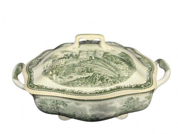 • Cerâmica Matarazzo (Fundada no início do século XX, a fábrica ficava em São Caetano do Sul, São Paulo), uma (1) terrina confeccionada em faiança na tonalidade branca, ricamente decorada por paisagem de castelo, elementos florais e vegetalistas na tonalidade verde, borda em recortes, tampa bicada na borda, apresenta leves marcas do tempo, medindo 14x26x20cm.
