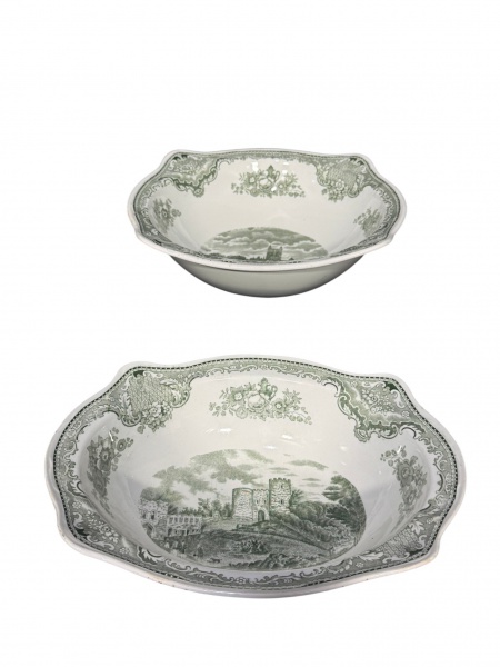 • Cerâmica Matarazzo (Fundada no início do século XX, a fábrica ficava em São Caetano do Sul, São Paulo), duas (2) peças, sendo: A) 1 saladeira, medindo 7,5x24,5x24,5cm e B) 1 travessa oval funda, medindo 6,5x26x21cm, confeccionados em faiança na tonalidade branca, ricamente decorada por paisagem de castelo, elementos florais e vegetalistas na tonalidade verde, borda em recortes.