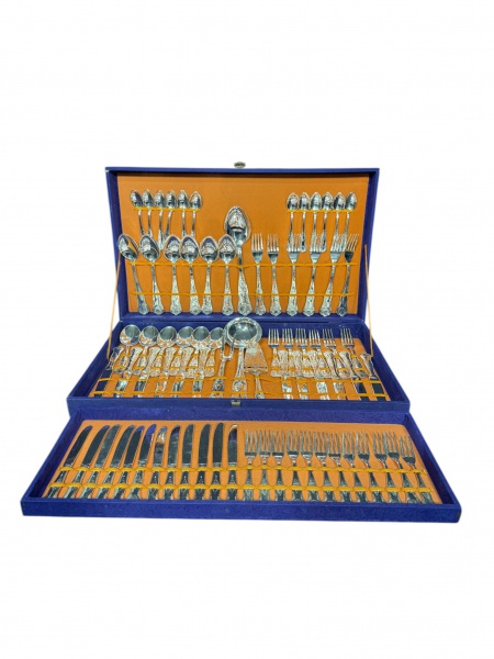 • FAQUEIRO, faqueiro com setenta e seis (76) peças confeccionadas em metal espessurado a prata, cabo cinzelado por concheados e arabescos em recortes, sendo: A) 12 facas para jantar serrilhadas, B) 12 garfos para jantar, C) 12 facas para sobremesa, D) 12 garfos para sobremesa, E) 12 colheres de sopa, F) 12 colheres para sobremesa, G) 4 peças de servir, sendo: 1 concha, 1 colher de arroz, 1 pá para bolo e 1 garfo trinchante, banho em bom estado, apresentando manchas do tempo. Acondicionada em estojo revestido em papel aveludado na tonalidade rocha, com desgastes.