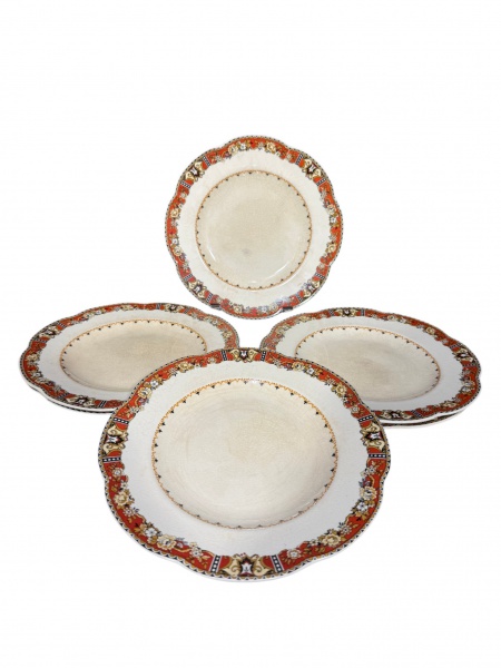 • Wood & Sons (Woods Ivory Ware é uma linha de louça inglesa da manufatura Wood & Sons, de Burslem, Stoke-on-Trent. A empresa atuou desde o século XIX, e a denominação Ivory Ware foi introduzida por volta de 1930), seis (6) pratos fundos, confeccionados em faiança inglesa na tonalidade marfim, decorada por guirlanda floral sobre fundo abóbora, elementos geométricos e elementos vegetalistas, medindo 22,5cm de diâmetro, todos com marcas do tempo.