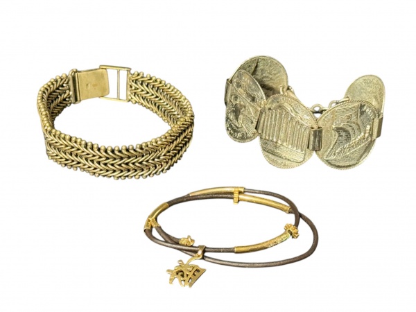 • BIJUTERIAS, lote com três (3) peças, sendo: A) 1 pulseira confeccionada em metal prateado, fecho de trava, medindo 24m de comprimento, B) 1 gargantilha em couro, elos cilíndricos em metal dourado com pingente representando caractere oriental em vazados, ausência do fecho, medindo 38cm de comprimento e C) 1 pulseira com elos redondos, cinzelados por paisagens de Portugal em relevo, apresentando falhas na prateação, medindo 20cm de comprimento.