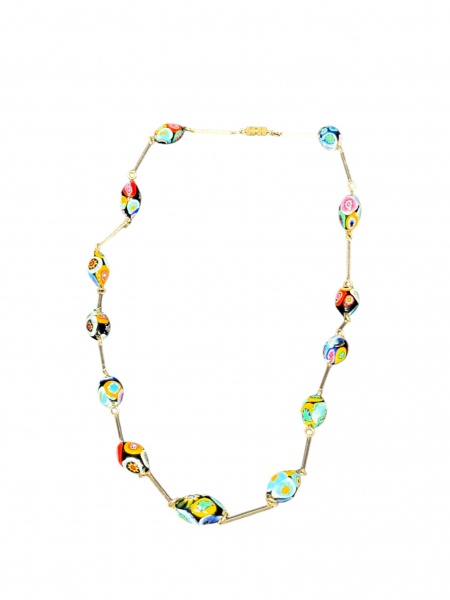 • BIJUTERIA, um (1) colar com contas em vidro de Murano millefiori de tonalidades distintas, intercalados por elos em metal prateado, fecho em rosca com falhas na prateação, medindo 75,5cm de comprimento.