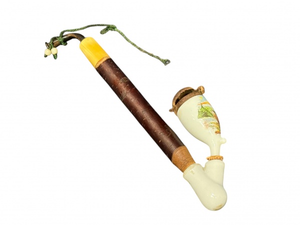 • COLECIONISMO, um (1) cachimbo oriental de haste longa, em madeira e porcelana branca, com fornilho decorado por paisagem policromada e arremates em metal. Peça apresentando pendente em cordão, sinais do tempo, desgastes, oxidações e marcas de uso, medindo 22cm de comprimento.