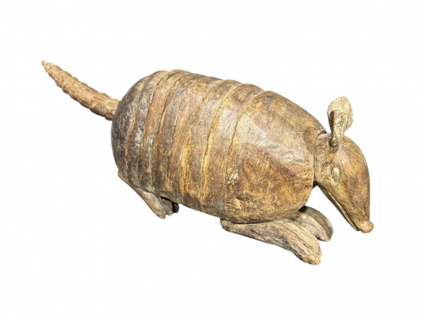• ESCULTURA, uma (1) grande escultura confeccionada em madeira entalhada a mão representando tatu, medindo 28x70x15cm,