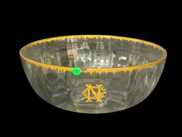 • CRISTAL EUROPEU, uma (1) saladeira confeccionada em cristal translucido canelado, borda decorada em ouro com monograma NG ao centro em reserva, apresenta bicado na borda, vide foto, medindo 10x25,5cm.