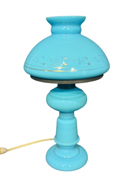 • ABAJUR, um (1) abajur para uma lâmpada confeccionado em OPALINA na tonalidade azul, corpo torneado, guarnição em metal dourado e cúpula dita COGUMELO, apresenta pequenos bicados, vide foto, medindo 35x17,5cm, vestígios de douração.