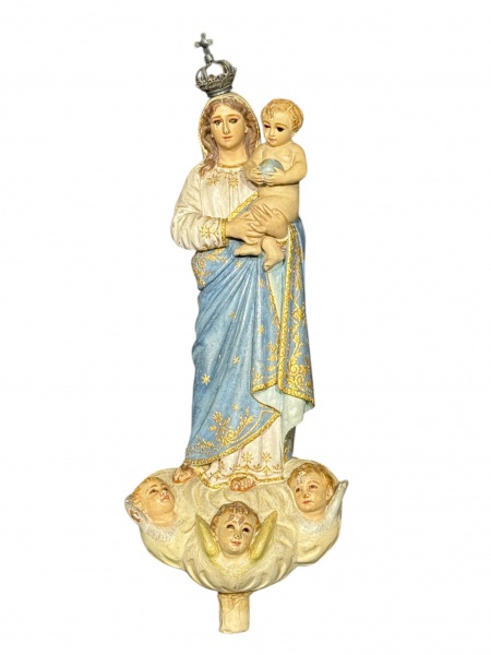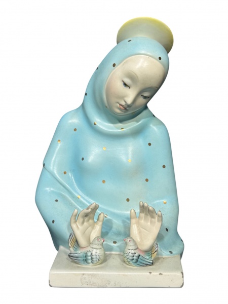 • ARTE SACRA, uma (1) imaginária confeccionada em faiança italiana representando Madona, vestes na tonalidade azul decorada porcirculos dourados, pássaros policromados, marcado no verso, medindo 29cm de altura, apresentando discretos bicados.