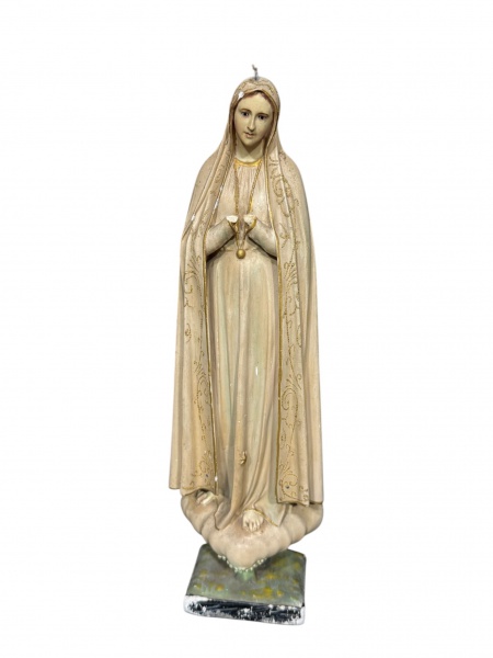 • ARTE SACRA, uma (1) imaginária confeccionada em estuque patinado na tonalidade marfim representando Nossa Senhora de Fátima, realces em douração, olhos em vidro, apresenta quebra nas mãos, bicados e falhas na patina, vendida no estado da foto, medindo 41cm de altura.