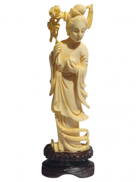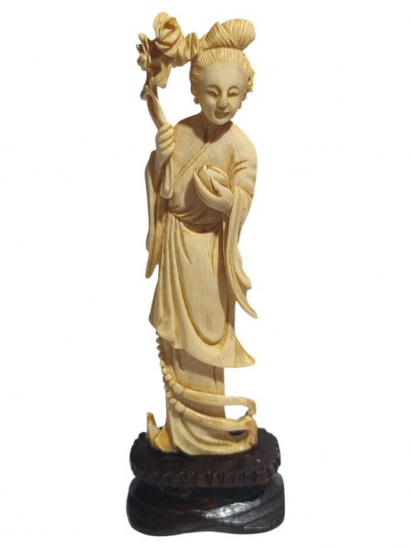 • ESCULTURA, uma (1) escultura confeccionada em MARFIM entalhado a mão, representando gueixa (apresentando quebra no lírio da mão), apoiada sobre base em madeira escura, medindo 15cm de altura.