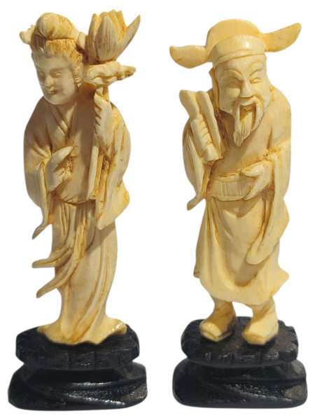 • ESCULTURAS, duas (2) esculturas, confeccionadas em MARFIM entalhado a mão, representando Gueixa e Sábio Chinês, apoiados sobre base em madeira escura, ambos medindo 9cm de altura.
