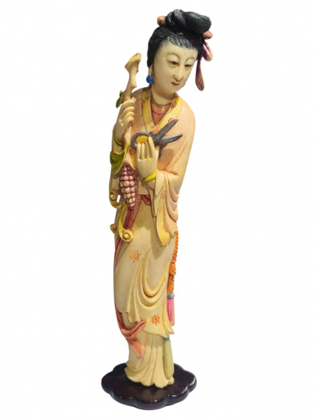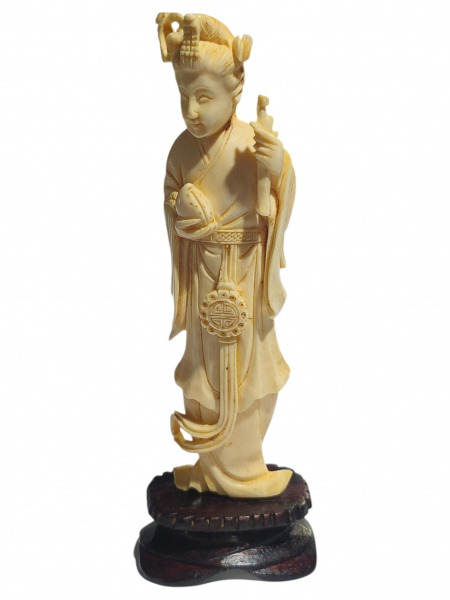• ESCULTURA, uma (1) escultura, confeccionada em MARFIM entalhado a mão, representando gueixa, decorada em vazados, apoiada sobre base em madeira escura (com sinais de cola na base, vide foto), medindo 14,5cm de altura.