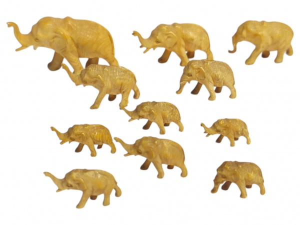 • ESCULTURAS, onze (11) esculturas representando elefantes, confeccionadas em MARFIM entalhado a mão, de modelos e tamanhos distintos, maior medindo 3x5cm e menor 1,5cm de comprimento.