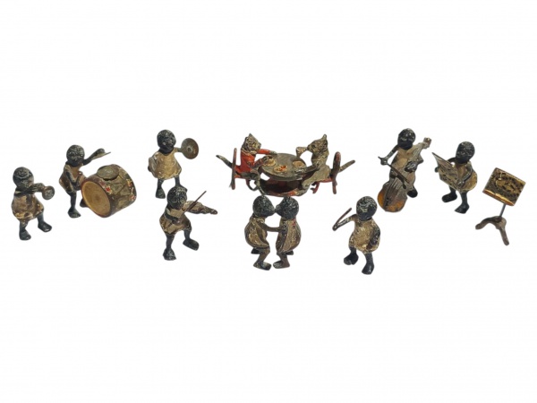• MINIATURAS, dez (10) miniaturas confeccionadas em bronze patinado representando músicos, casal dançando e casal de gatos sentado sobre mesa, apresentam falhas na patina, medindo 2,5cm a 1,5cm de altura.