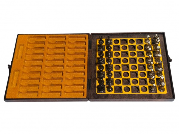 • DIVERSOS, um (1) pequeno tabuleiro de xadrez de viagem, da manufatura TOMASETTO ACHILE, confeccionado em material plástico, 32 peças em plástico pintado com falhas na pintura, em bom estado de conservação, medindo fechado 14x14cm.