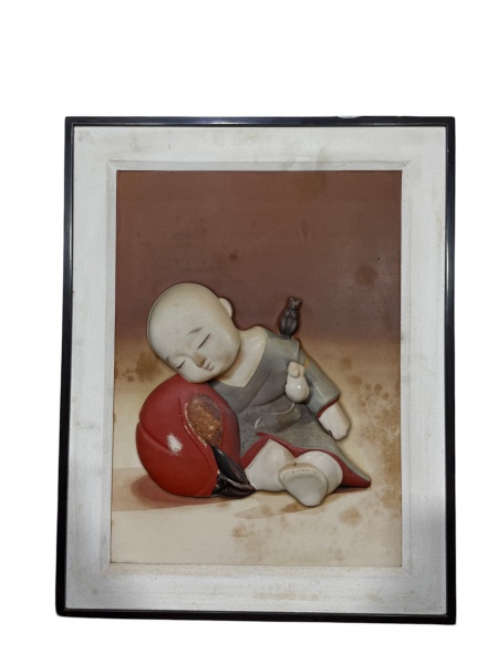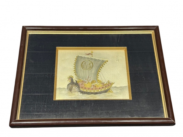 • QUADRO, uma (1) composição decorativa de parede, apresentando placa central em metal dourado com representação de embarcação oriental em relevo, com detalhes policromados, assinado, protegida por moldura com fundo escuro e cercadura em madeira, medindo 30x40,5cm e obra 15x19cm. Moldura com falhas.