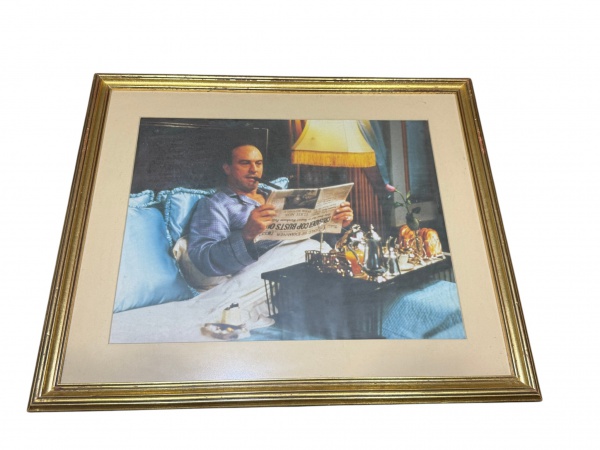 • QUADRO, uma (1) reprodução de cena cinematográfica/televisiva com personagem masculino em ambiente interno, reclinado na cama e lendo jornal, com bandeja de serviço e abajur ao fundo, protegida por vidro, com passe-partout claro e moldura em madeira com patina dourada, medindo 57x68cm.