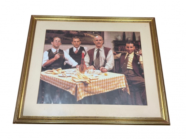 • QUADRO, uma (1) reprodução de cena cinematográfica/televisiva com quatro personagens masculinos reunidos à mesa, em ambiente interno com ambientação de época, protegida por vidro, com passe-partout claro e moldura em madeira com patina dourada, medindo 57x68cm.