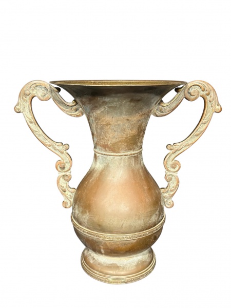 • METAL PRATEADO, uma (1) ânfora confeccionada em metal espessurado a prata da manufatura ART PRATA, faixas cinzeladas por elementos vegetalistas e alças laterias em arabescos recortados, necessita banho, medindo 40x42x27cm.