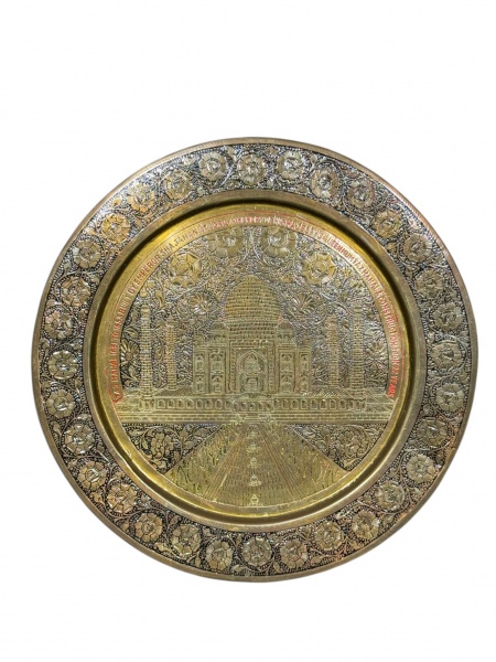 • METAL DOURADO, um (1) prato decorativo em metal dourado, com representação do Taj Mahal ao centro, ricamente ornado com motivos florais e inscrição comemorativa em torno da cena, medindo 24,5cm.