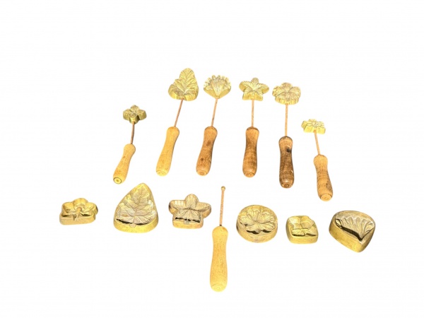 • DIVERSOS, treze (13) sinetes ou carimbos para artesanato, confeccionados em bronze, com diferentes matrizes em relevo, representando folhas e flores, acompanham 7 cabos em madeira torneada, maior peça medindo 9,5x7cm e menor 5,5cm.