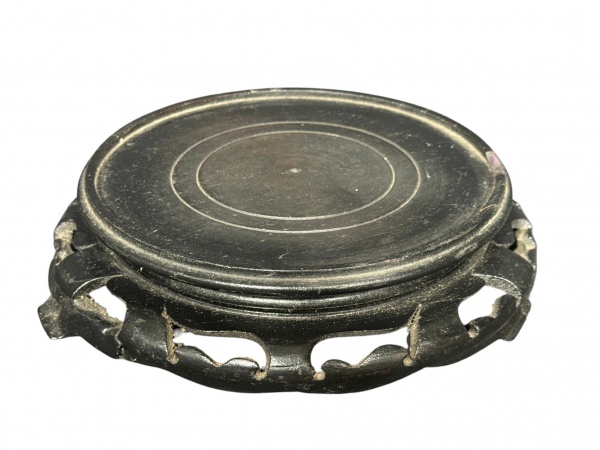 • DIVERSOS, uma (1) peanha circular confeccionada em madeira, entalhes vazados, verniz escuro, apresentando bicado na borda e restauro no pé, medindo 6x26x20cm.