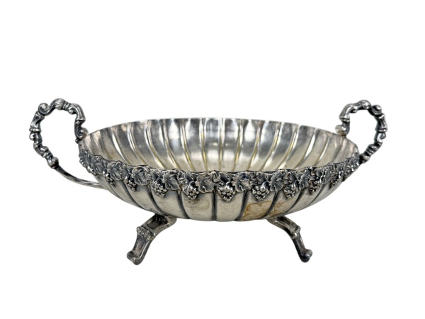 • METAL PRATEADO, uma (1) fruteira/centro de mesa confeccionado em metal espessurado a prata, corpo em gomos e borda cinzelada em cachos de uva e folhas de parreira, apoiada sobre 3 pés recortados e alças laterias vazadas, apresentam falhas na prateação, medindo 17x40x30cm.