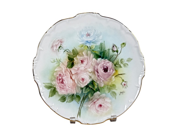 • PORCELANA, um (1) prato decorativo confeccionado em porcelana na tonalidade branca, com pintura de flores e folhagens em policromia, assinado GUIDA, borda em recortes, filetados em ouro, medindo 27cm.