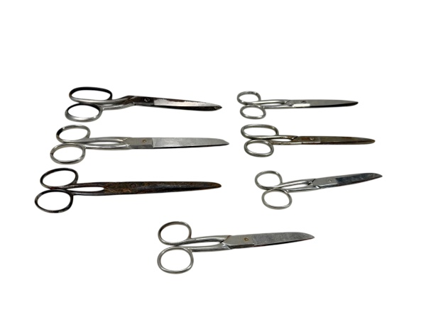 • CUTELARIAS, lote com sete (7) tesouras de costura confeccionadas em ferro/aço de modelos, tamanhos e marcas distintas, vendidas no estado da foto, algumas com sinais de oxidação, medindo 20cm e menor 15cm.