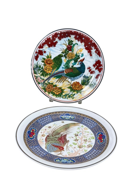 • PORCELANAS, dois (2) pratos decorativos confeccionados em porcelana na tonalidade branca, sendo: A) RENNER MEDAILLON, um prato circular com composição de faisões entre flores e folhagens, medindo 25cm e B) RENNER MEDAILLON, um prato circular com ave junto à vegetação, com borda ornamentada em tons de azul e dourado, medindo 25cm.
