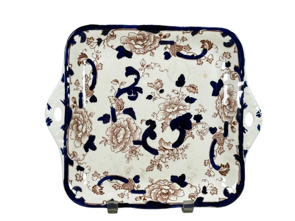 • MASONS (tradicional manufatura inglesa de louça e ironstone, fundada no século XIX), padrão Mandalay, uma (1) bandeja quadrada confeccionada em faiança inglesa na tonalidade branca, decorado por elementos florais na tonalidade marrom com realces na tonalidade azul cobalto, alças vazadas, sinais de craquele com leves marcas do tempo, medindo 27x23cm.