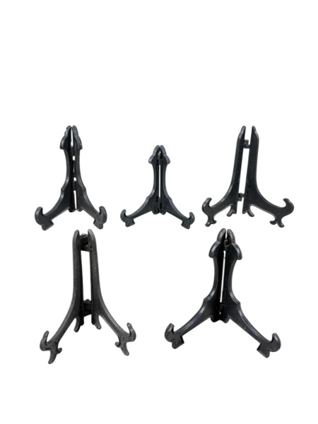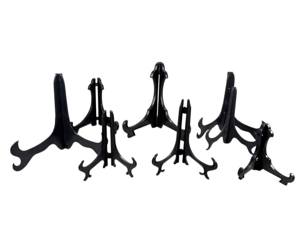• DIVERSOS, cinco (5) suportes para pratos, confeccionados em plástico rígido na cor preta, maior medindo 12x15cm e menor 10x10cm.