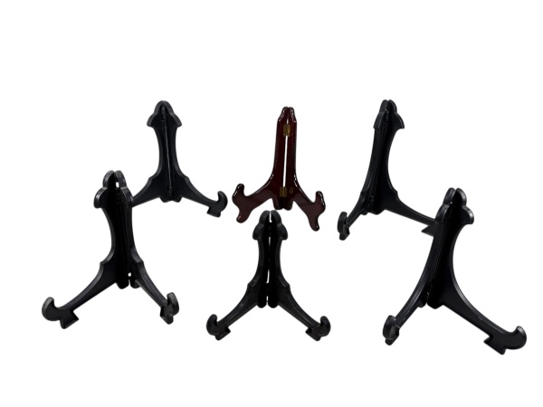 • DIVERSOS, seis (6) suportes para pratos de modelos e tamanhos distintos, sendo 5 em plástico rígido na tonalidade preta e 1 em madeira avermelhada, maior medindo 20x18,5cm e menor 12,5x12cm.