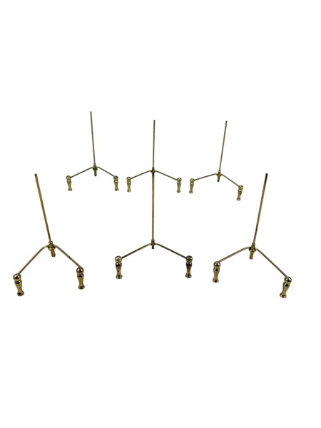 • METAL DOURADO, seis (6) suportes para pratos confeccionados em metal dourado, hastes cilíndricas e pés torneados, apresentam falhas na douração, medindo 14x8cm.