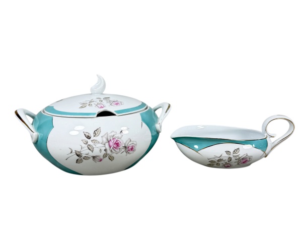 • PORCELANA SCHMIDT, duas (2) peças, confeccionadas em porcelana nacional na tonalidade branca, decorada por recortes esmaltados na tonalidade verde com pintura de flores em policromia com adornos filetados em ouro, pega da tampa no feitio de meia lua com bicado, apresentando falhas na douração, sendo: A) 1 sopeira, medindo 17x30x20cm e B) 1 molheira, medindo 9,5x23x10cm.