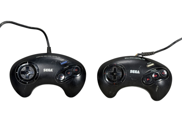 • VIDEO GAMES, dois (2) controles da marca SEGA, em material sintético na cor preta, modelos para console Mega Drive, com botões direcionais, teclas A, B e C, além de botão Start. Peças apresentando sinais de uso e do tempo. Sem testes. Sem garantia de funcionamento, medindo 9,5x16cm.