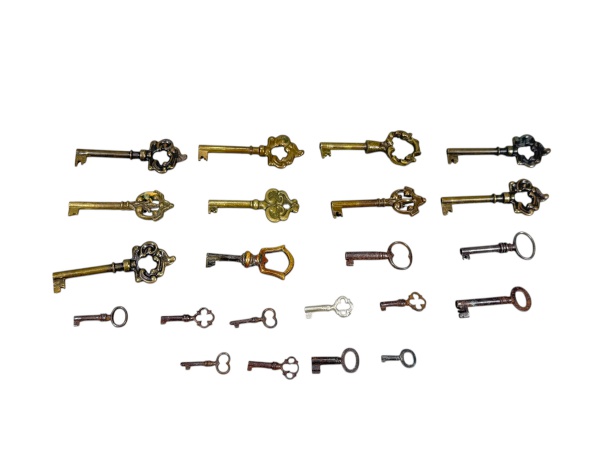 • DIVERSOS, vinte e duas (22) chaves para móveis confeccionadas em bronze/ferro de modelos, tamanhos e cinzelados distintos, maior medindo 7,5cm e menor 3cm.