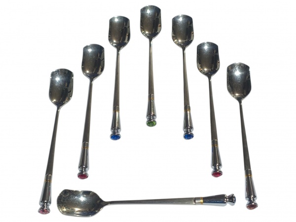 • METAL INOX, oito (8) colheres para sobremesa, confeccionadas em aço inox, cabos com incrustação de cristais de tonalidades distintas com lapidação facetada.