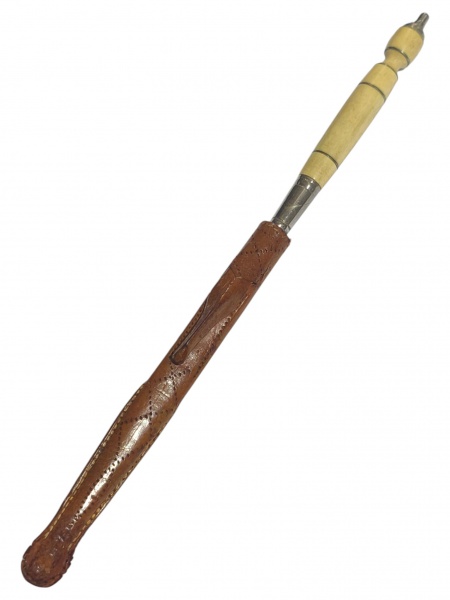 • CUTELARIA ARTESANAL NORDESTINA, um (1) punhal, lâmina confeccionada em aço inox, sem gume, cabo torneado com osso ou similar, bainha em couro pirografado com desgastes de cupim, medindo 19,5 cm comprimento, sinais de oxidação na lâmina.