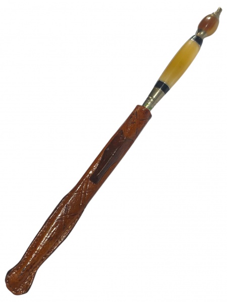 • CUTELARIA ARTESANAL NORDESTINA, um (1) punhal, lâmina confeccionada em aço inox, sem gume, cabo torneado com elos em baquelite, chifre polido e metal, bainha em couro pirografado, medindo 20 cm comprimento, excelente estado de conservação.