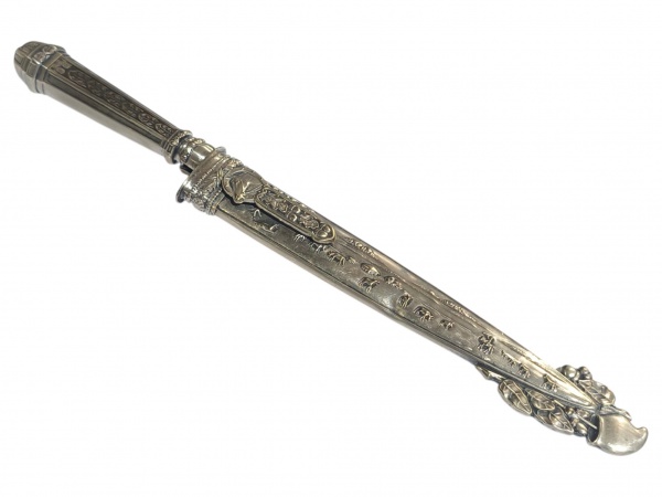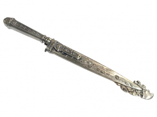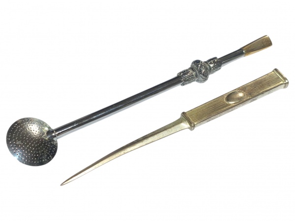 • METAL PRATEADO, lote com duas (2) peças, sendo: A) 1 bomba para chimarrão, confeccionado em metal prateado, haste cilíndrica, decorada com botão de rosa (solto) e boquilha em metal dourado com falhas na douração, marcado MB, medindo 24cm de comprimento e B) 1 abridor de cartas, confeccionada em metal prateado com cabo cinzelado em caneluras, apresenta falhas na prateação e mossa na lâmina, medindo 20,5cm.