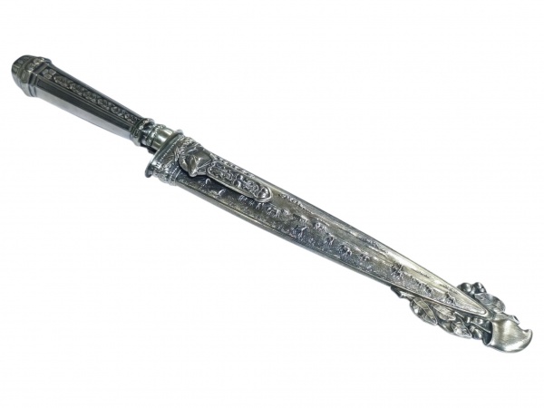 • CORNETA (Abramo Eberle, 1896), uma (1) faca dita de GAÚCHA, lâmina em aço inox, possui marca da manufatura CORNETA (uma das pioneiras em cutelaria no Brasil, fundada pelos irmãos Berg, com tradição no ramo desde 1787 na Alemanha, começou as atividades comerciais no Brasil em 1902 e passou a fabricar aqui a partir de 1932, sofreu intervenção em 1943 devido a Segunda Guerra e a partir de 1948 tornou-se 100% nacional), cabo e bainha, confeccionados em metal espessurado a prata com rico cinzelado do cotidiano gaúcho e elementos vegetalistas, medindo 31,5cm de comprimento.