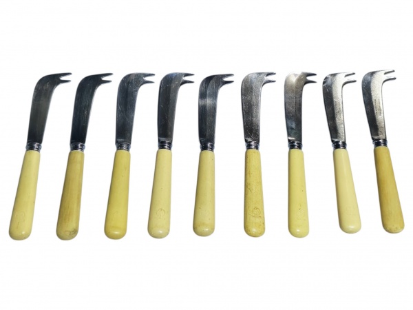 • HERCULES INOX e VARIG (Durante as décadas de ouro da aviação, especialmente entre os anos 60 e 80, a Hercules foi a principal fornecedora de talheres para o serviço de bordo da companhia), nove (9) espátulas para queijos/patê confeccionadas em aço inox, cabo plástico com marcação da VARIG, sinais de uso.