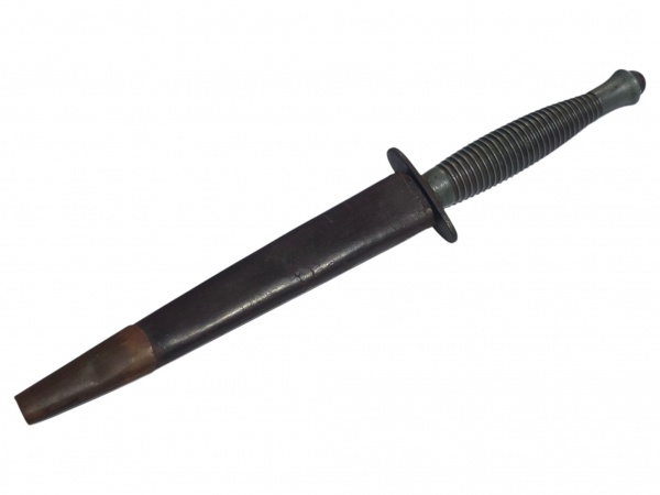 • MILITARIA, uma (1) baioneta, com lâmina em aço carbono e cabo em metal patinado na tonalidade cinza, cinzelada em caneluras, bainha em couro na tonalidade marrom com pequnos desgastes e ponteira em metal, sinais de oxidação na lâmina, porém, conservadissima, medindo 30,5cm de comprimento.